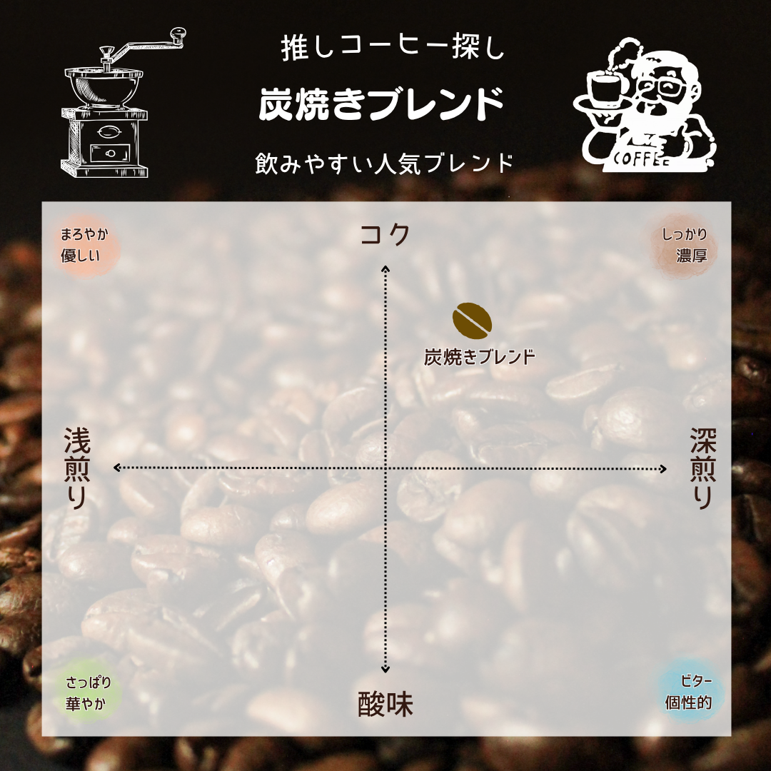 炭焼きブレンド 2026.03.302026.04.06 ¥800 (税込) 豆の状態 選択してください豆挽 容量 選択してください100g200g300g400g500gクリア 炭焼きブレンド個 お買い物カゴに追加 商品一覧に戻るカートを確認 商品コード: 該当なし カテゴリー: コーヒー豆 説明 追加情報 説明 独特の香ばしさの秘密は豆の芯から火が通り、ふっくらと焼ける炭焼焙煎ならでは!カスタムブレンドと並ぶ、人気ブレンドです! 追加情報 豆の状態 豆, 挽 容量 100g, 200g, 300g, 400g, 500g 関連商品 ブラジル ¥950 (税込) オプションを選択 この商品には複数のバリエーションがあります。 オプションは商品ページから選択できます ケニア ¥1,100 (税込) オプションを選択 この商品には複数のバリエーションがあります。 オプションは商品ページから選択できます 直火焼きブレンド ¥800 (税込) オプションを選択 この商品には複数のバリエーションがあります。 オプションは商品ページから選択できます モカブレンド ¥900 (税込) オプションを選択 この商品には複数のバリエーションがあります。 オプションは商品ページから選択できます